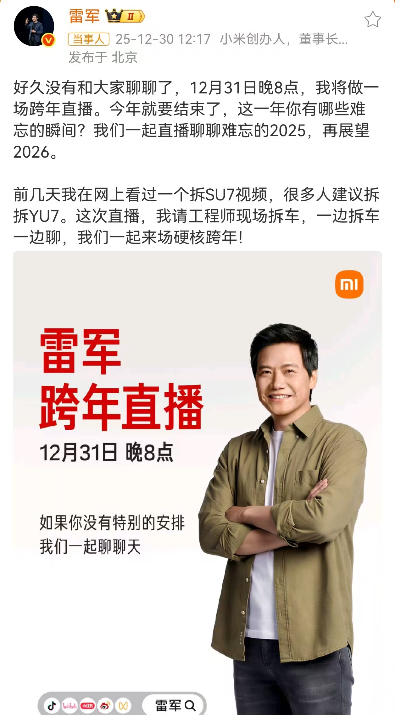 上证报中国证券网讯(记者刘暄)“好久没有和大家聊聊了,12月31日晚8点,我将做一场跨年直播。今年就要结束了,这一年你有哪些难忘的瞬间?我们一起直播聊聊难忘的2025,再展望2026。”小米集团创始人、董事长兼CEO雷军12月30日在其个人微博发文称,12月31日晚将做一场跨年直播,并表示将直播现场拆车。